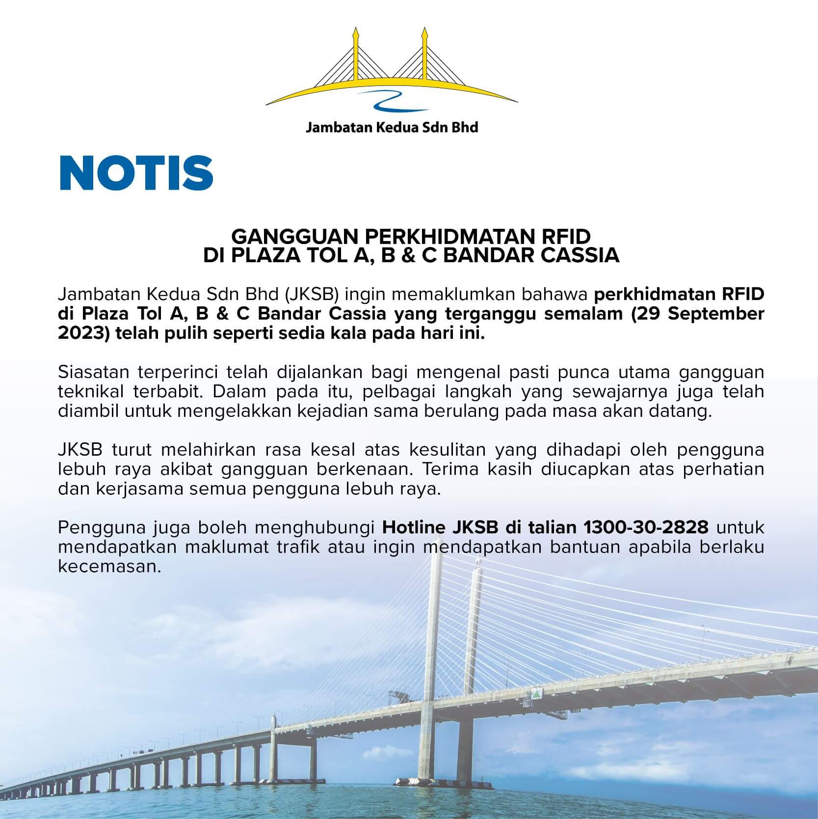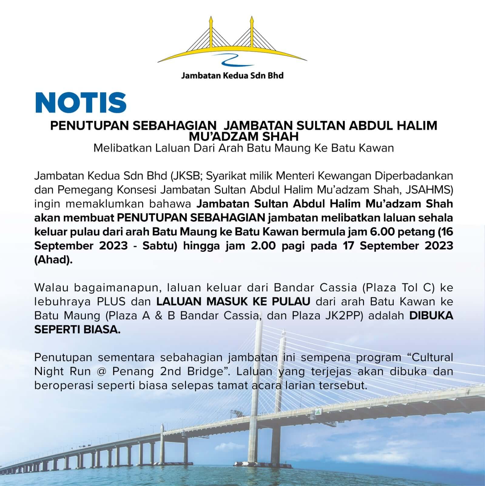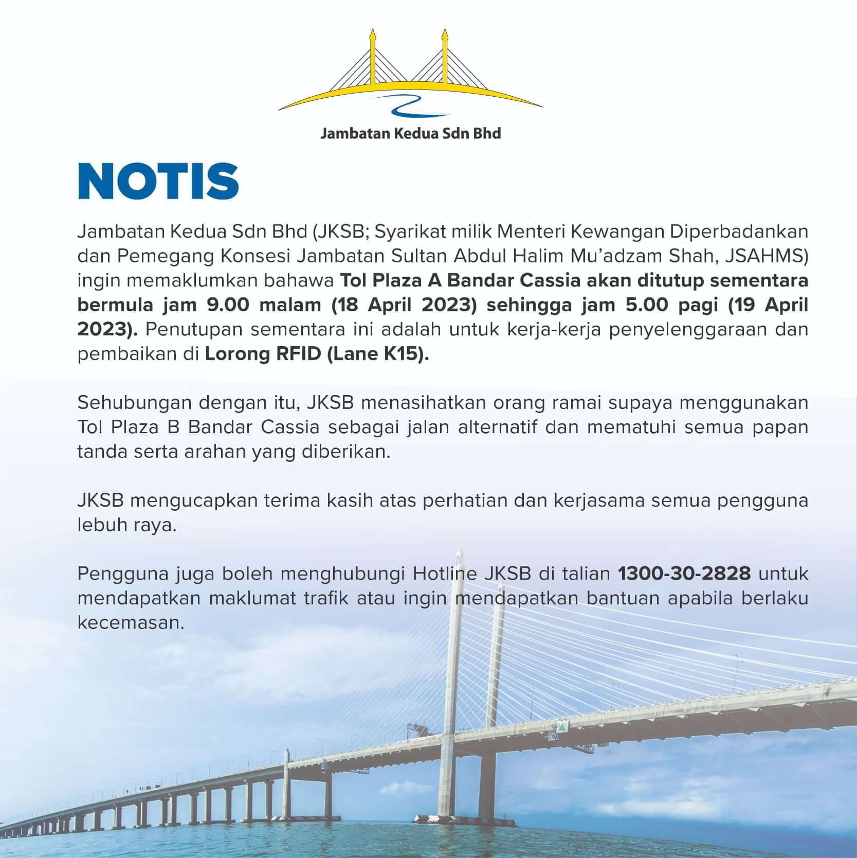 Stay informed with timely updates on bridge closures, scheduled maintenance, and other important alerts for the Sultan Abdul Halim Mu’adzam Shah Bridge (JSAHMS). This section provides essential information to help you plan a smooth, safe, and uninterrupted journey across the bridge.