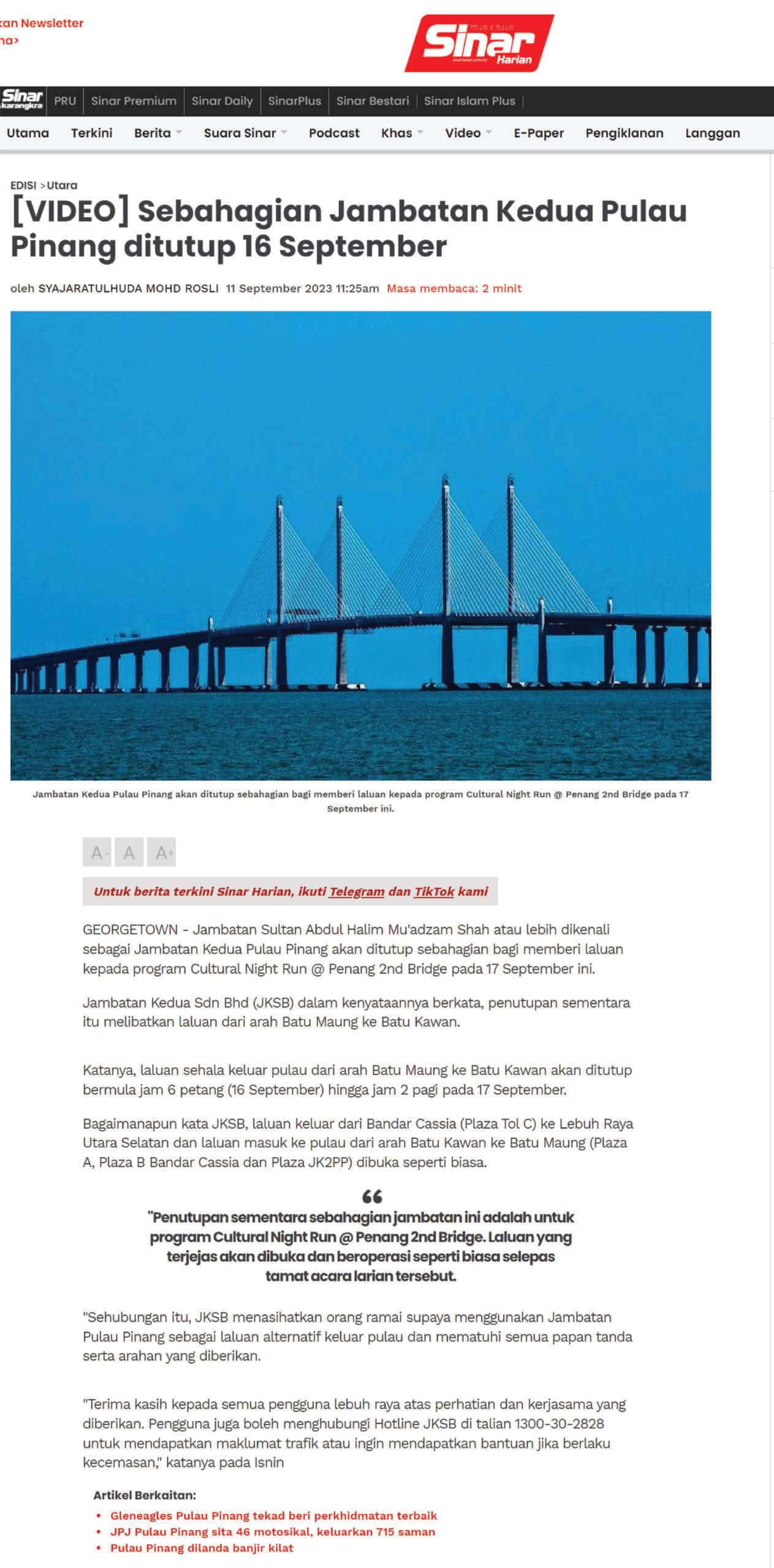 Sebahagian Jambatan Kedua Pulau Pinang ditutup 16 September